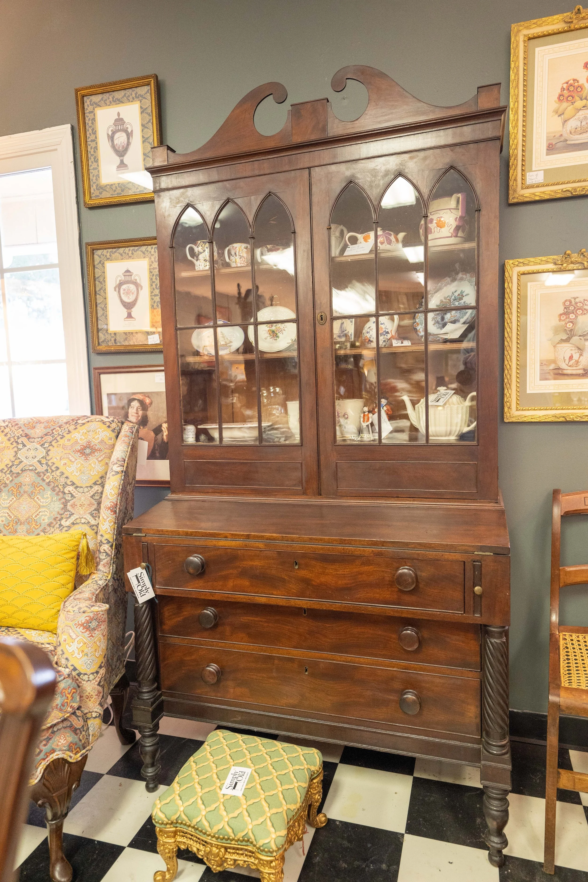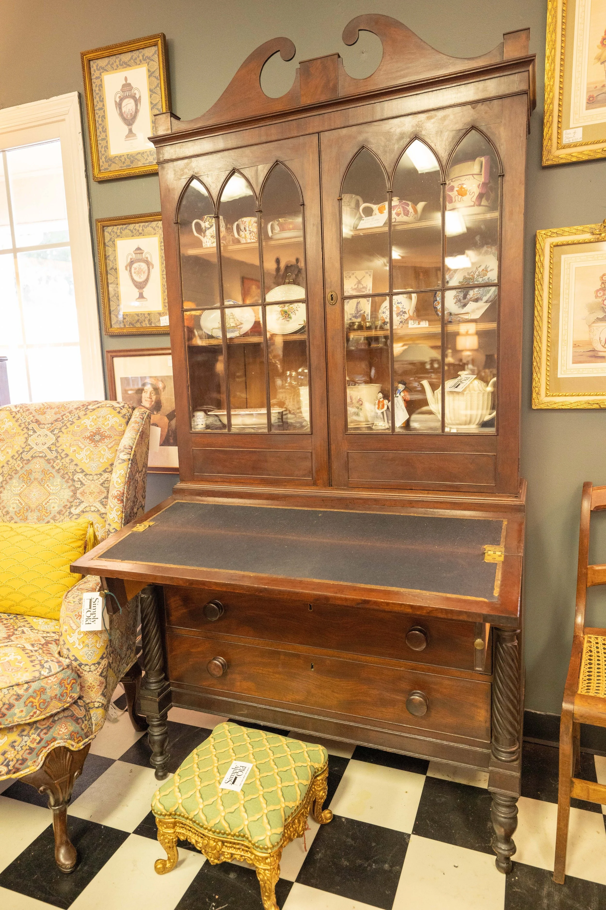 Description: Circa 1860s, Solid mahogany with turned columns. Original wooden knobs and glass. Original felt writing surface. Hidden drawers behind glass doors.